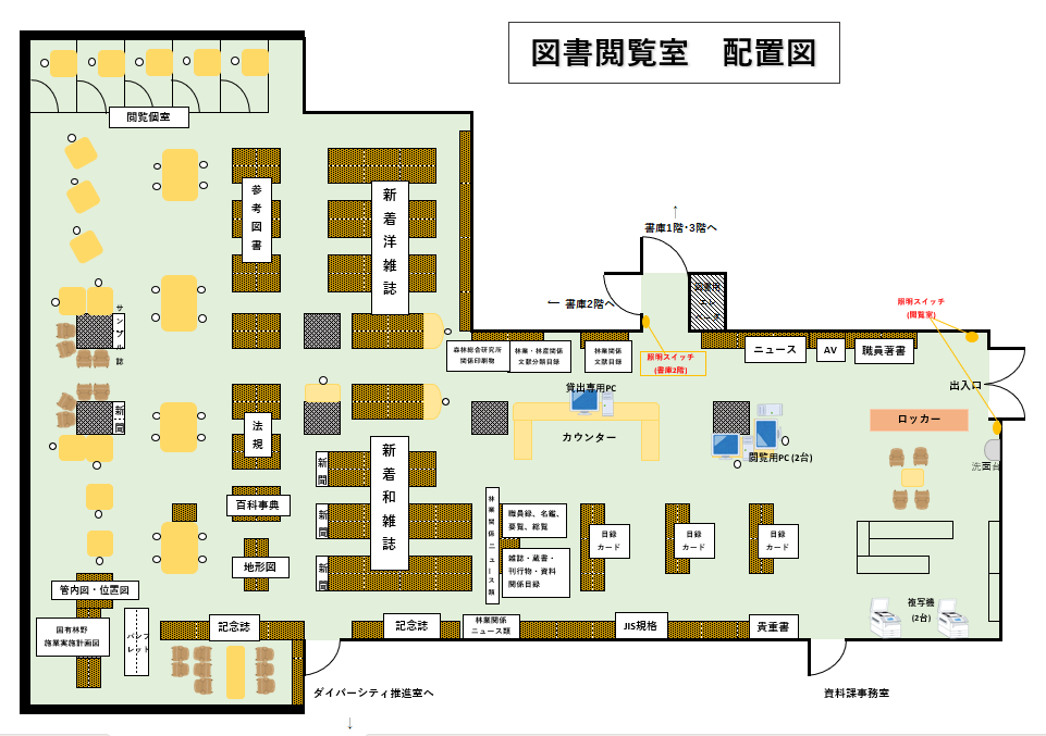 閲覧室(2F)… 新着和・洋雑誌、職員著書、参考図書、ニュース、地図類 等