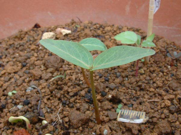 見分けるポイント: 大型の芽生えで薄く広い子葉を持ち、白い葉脈がはっきり見えます。胚軸も太くしっかりしています。