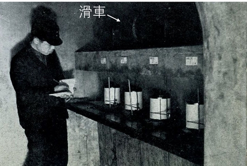 グライドは斜面上の樹木の成育を妨げ,また全層雪崩の発生に至ることがあるため,多雪地の林業や雪崩災害防止のためには,まずグライドの実態を明らかにすることが必要でした.森林測候所から森林治水試験地に改名して存続することになって間もない十日町試験地では,早速,グライドを観測するために傾斜40度,斜距離40 mの実験斜面が整地され,斜面に沿って地下道が造られました.地下道には積雪の動きを自動記録する装置が設置され(図2),1937/38年冬期にグライドを記録することに初めて成功しました(図3).雪が積もる前に実験斜面に杉材を置いておくと,斜面に積もった雪が下方へ移動するにつれて杉材も移動します.杉材につけたワイヤーロープを斜面に沿って造られた地下道に引き込み,滑車をつけて自記円筒時計のペンに連結することにより,移動量を時計仕掛けの用紙に原寸で記録しました(図4,5).これにより斜面上の積雪は絶えず移動していることとその移動速度が明らかになりました(勝谷,1943a).グライドが急に速まり,雪崩の発生に至るまでの過程を捉えることにも成功し,杭の有無によるグライドの比較測定により,杭打工によるグライド抑制効果も確かめられました.これらの斬新なアイディアによる先駆的な研究により,グライドと全層雪崩発生過程の解明が大きく進展しました.
