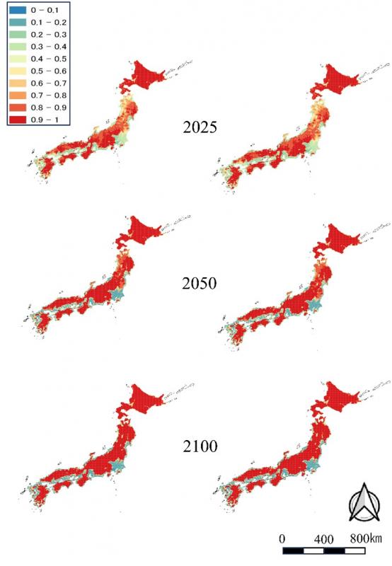 図2:2つの気候変動シナリオに基づくイノシシの分布確率の予測結果。