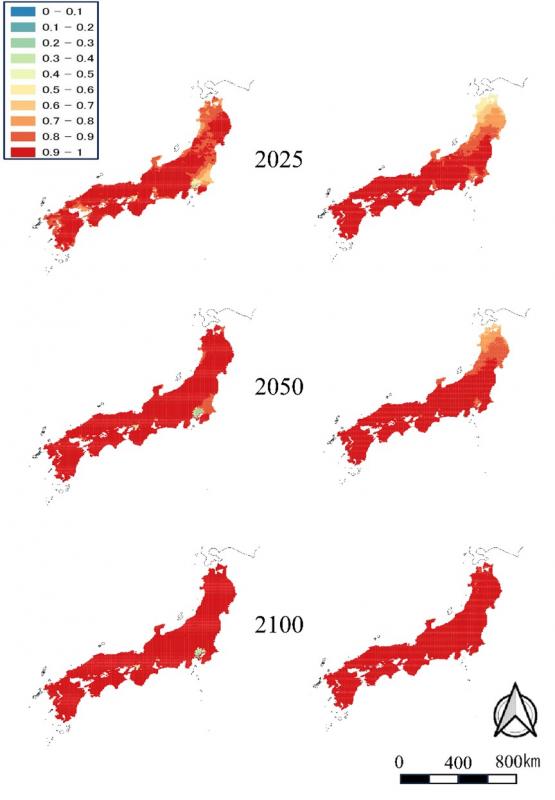 左:RCP2.6(注1)、右:RCP8.5(注2)。(Morosawa et al. 2026, Sci Repを基に作成)